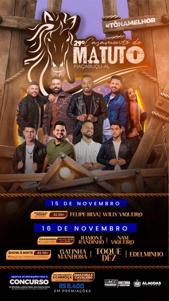 Piaçabuçu (AL) está em contagem regressiva para uma das festas mais esperadas do ano: o 29º Casamento do Matuto, que acontece nos dias 15 e 16 de novembro. O evento, que já é tradição no calendário cultural do município, promete reunir moradores e visitantes em uma grande celebração marcada por música, alegria e o verdadeiro espírito nordestino.